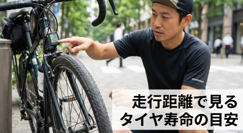走行距離でタイヤ寿命を判断する場合、一般的な自転車タイヤは約3,000kmが交換の目安とされています。ロードバイクやクロスバイクでは3,000km〜5,000km程度が目安となることもありますが、使用するタイヤの種類や路面状況によって大きく変わります。