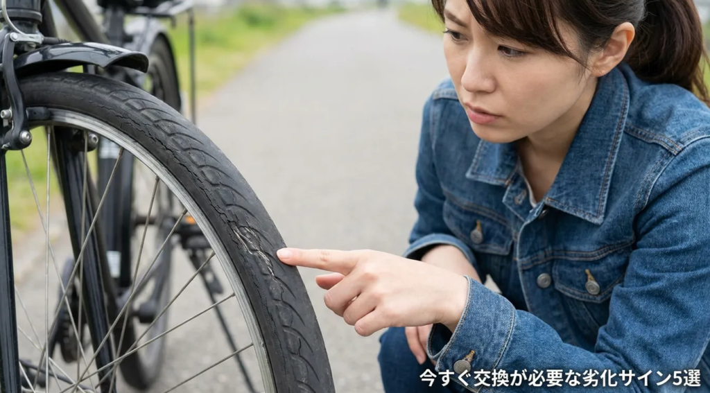 新品のタイヤは適度な弾力がありますが、劣化したタイヤは押しても硬く感じられます。ゴムが硬化するとグリップ力が低下し、特に濡れた路面や砂利道で滑りやすくなります。