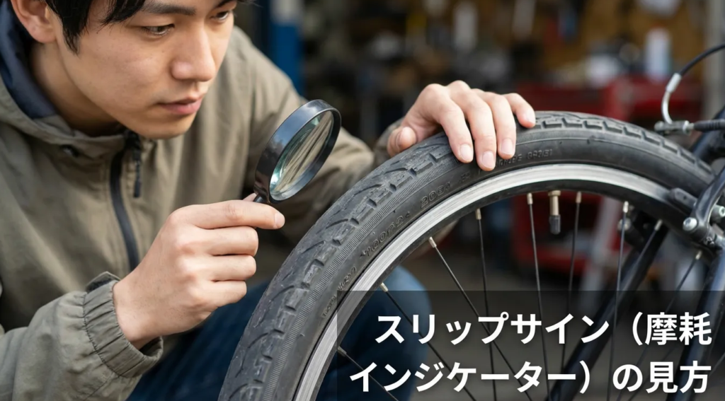 多くの自転車タイヤには、摩耗の限界を示すスリップサイン(摩耗インジケーター)が設けられています。これを活用することで、主観に頼らず客観的に交換時期を判断できます。定期的にタイヤを観察し、スリップサインの状態を確認する習慣をつけましょう。