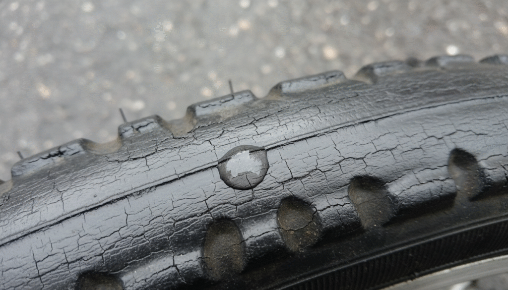 2つ目は「ケーシング(繊維)の露出」です。タイヤの側面(サイドウォール)や接地面が削れ、内部の糸のような繊維質(タイヤの骨格にあたるケーシング)が見えてきたら、それは末期の状態です。ゴム層が完全になくなっており、いつバースト(破裂)してもおかしくありません。このサインを見つけたら、即時交換が必要です。