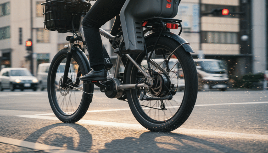 さらに決定的なのが、発進時や登坂時のアシストパワーです。ペダルを踏み込むと、モーターが強力な力でタイヤ(特に後輪駆動モデルの場合)を回転させます。この時、重い車体と乗員の体重を路面に押し付けながらタイヤが回転するため、路面との摩擦が非常に大きくなり、タイヤのゴムが強く削り取られます。